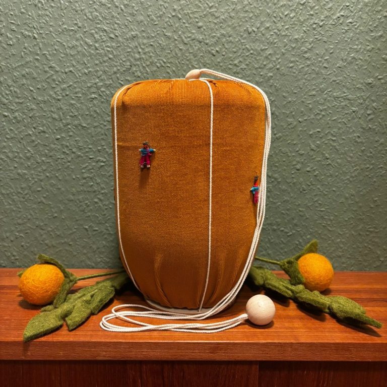 Überurne aus Kordstoff mit Sorgenpüppchen bestickt.