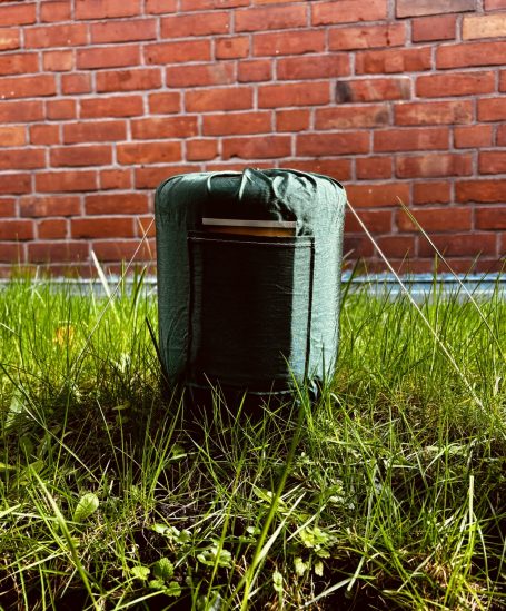 Oben und unten wird sie mit einem Kordelzug geschlossen.